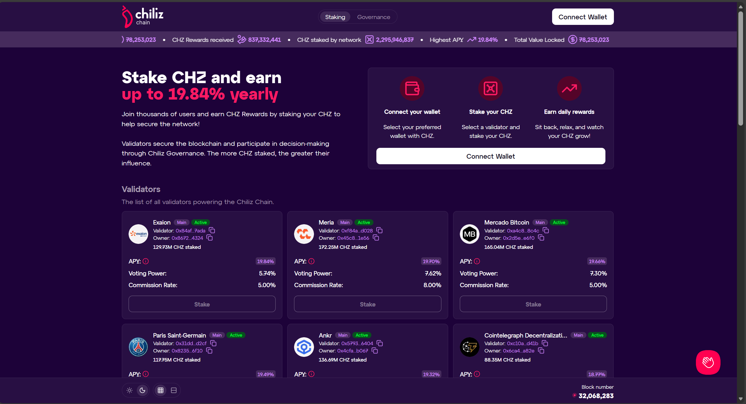 首先需要有一个CHZ代币的钱包, 个人比较推荐使用metamask的热钱包, 并在网络上选择自定义的Chiliz Chain Mainnet. 当你在交易所买完CHZ代币后, 用CHZ2网络发送到钱包(一定要确保接收端和发送端都要使用CHZ2网络! 如果一段使用ERC-20网络会导致CHZ直接丢失!). 登录Stake CHZ and Earn High APY – Secure and Grow Your Crypto, 连接钱包, 选一个年化高佣金低的节点即可质押, 一般质押的gas费在十几个左右.